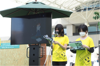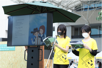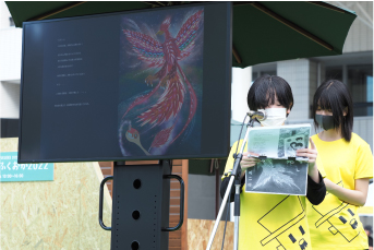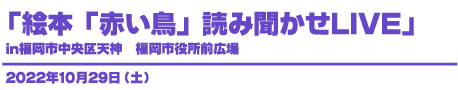 2022年10月29日(土)福岡市天神 福岡市役所前広場にて「環境フェスティバルふくおか2022」が開催されました。 くわきりょうさんの絵本「赤い鳥」読み聞かせLIVEに児童劇団リトルキャッツが参加、読み聞かせを担当させていただきました。